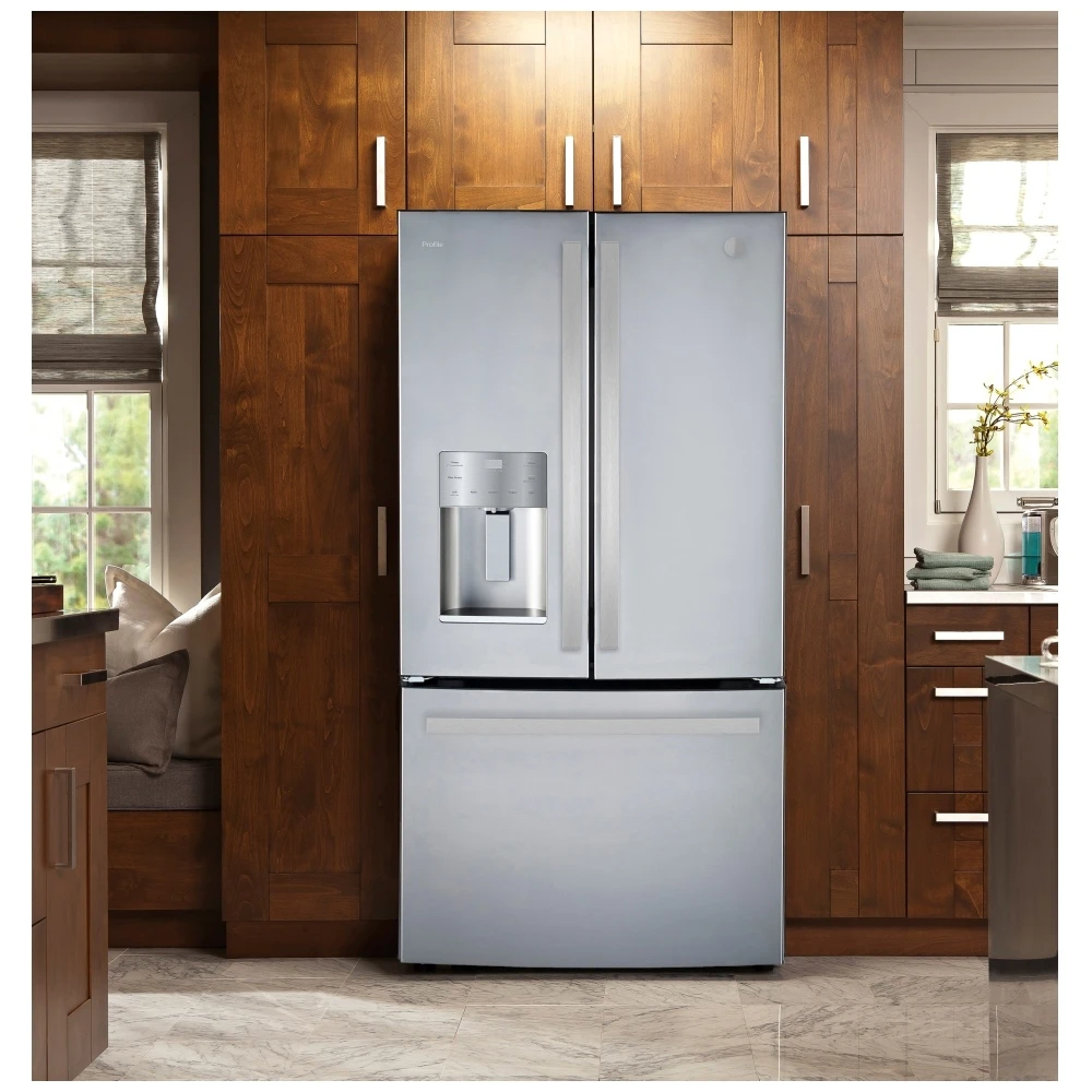 Le réfrigérateur à congélateur inférieur à portes françaises GE Profile PFE24HYRCFS est conçu pour offrir une grande capacité dans un format de 33 pouces, avec distribution externe pratique et efficacité énergétique certifiée.