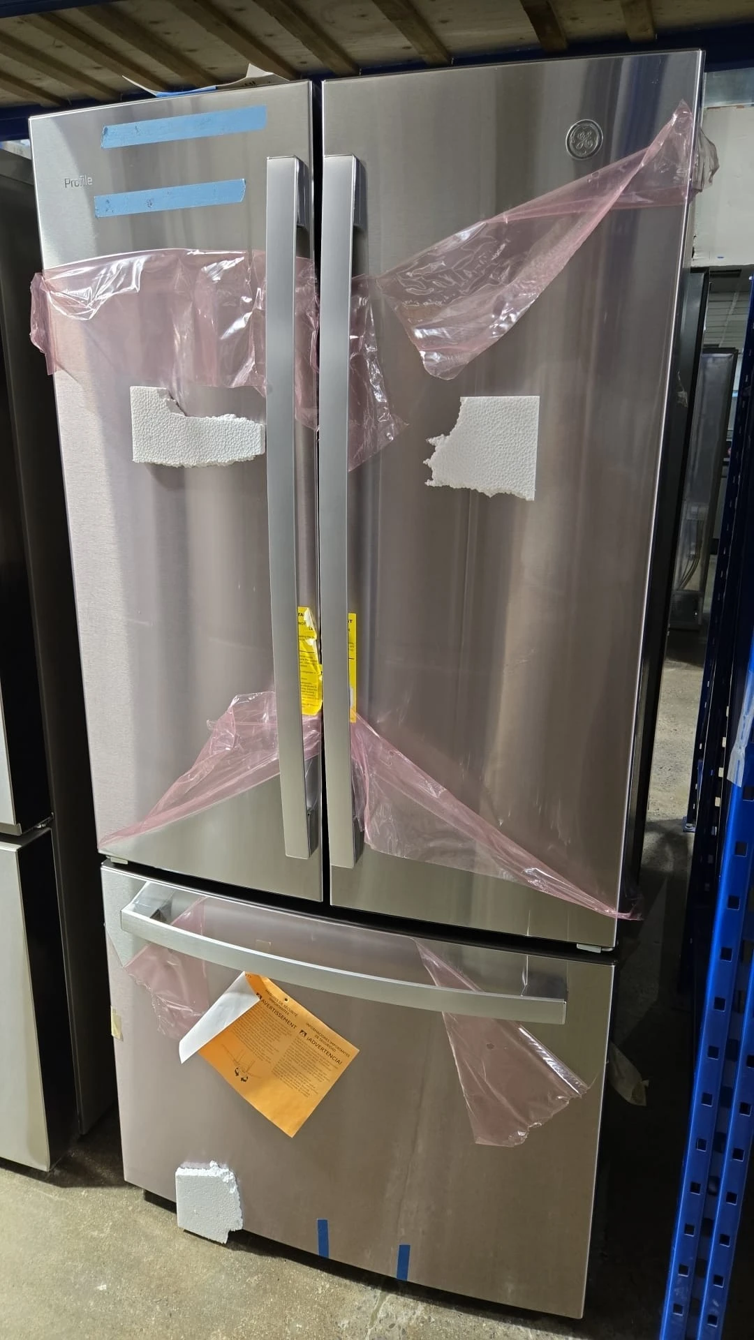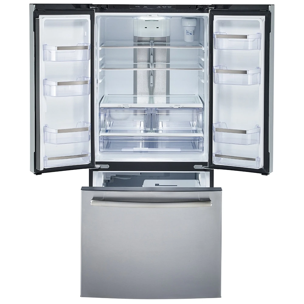 Le réfrigérateur à congélateur inférieur à portes françaises GE Profile PNE25NYRDKFS offre une capacité de 24,8 pi³ dans un format de 33 pouces, avec distribution intérieure et certification énergétique.