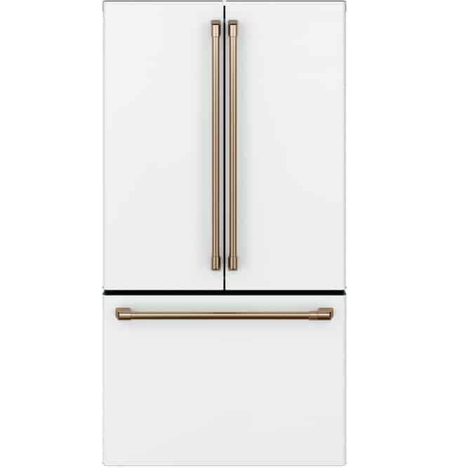 The 36" Café counter-depth smart French-door refrigerator offers 23.1 cu. ft. of premium storage capacity with a sophisticated Matte White finish and Brushed Bronze handles—designed for modern kitchens seeking luxury performance and advanced cooling technologies.