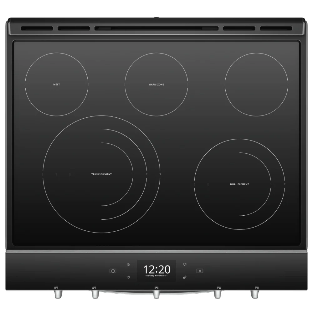 La surface de cuisson est équipée de cinq éléments électriques, incluant les éléments FlexHeat™ permettant d’adapter la zone de cuisson à différents formats de casseroles. La puissance maximale de 3 000 W assure une montée en température efficace pour toutes les préparations.